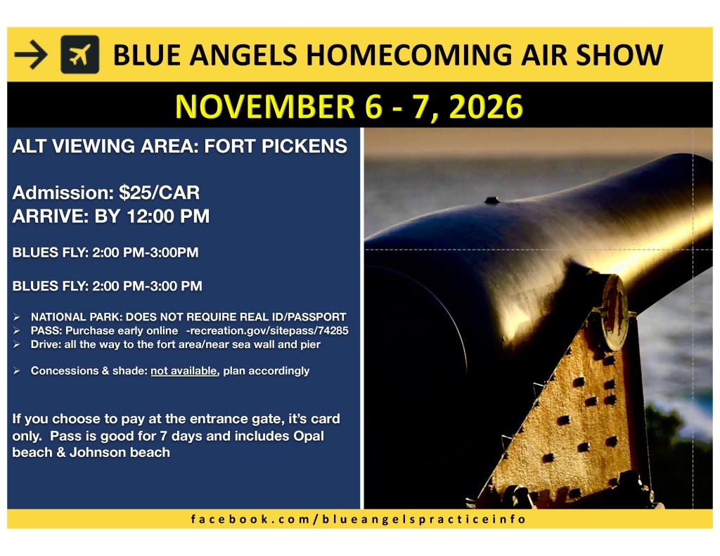 Are you looking for a zoomed-out, wide-angle view of the Blue Angels demonstration? Fort Pickens is a great option for you! The Fort is part of the Gulf Islands National Seashore and charges an entrance fee of $25 per car. This area gets crowded and should consider arriving 60-90 minutes prior to the demonstration beginning.