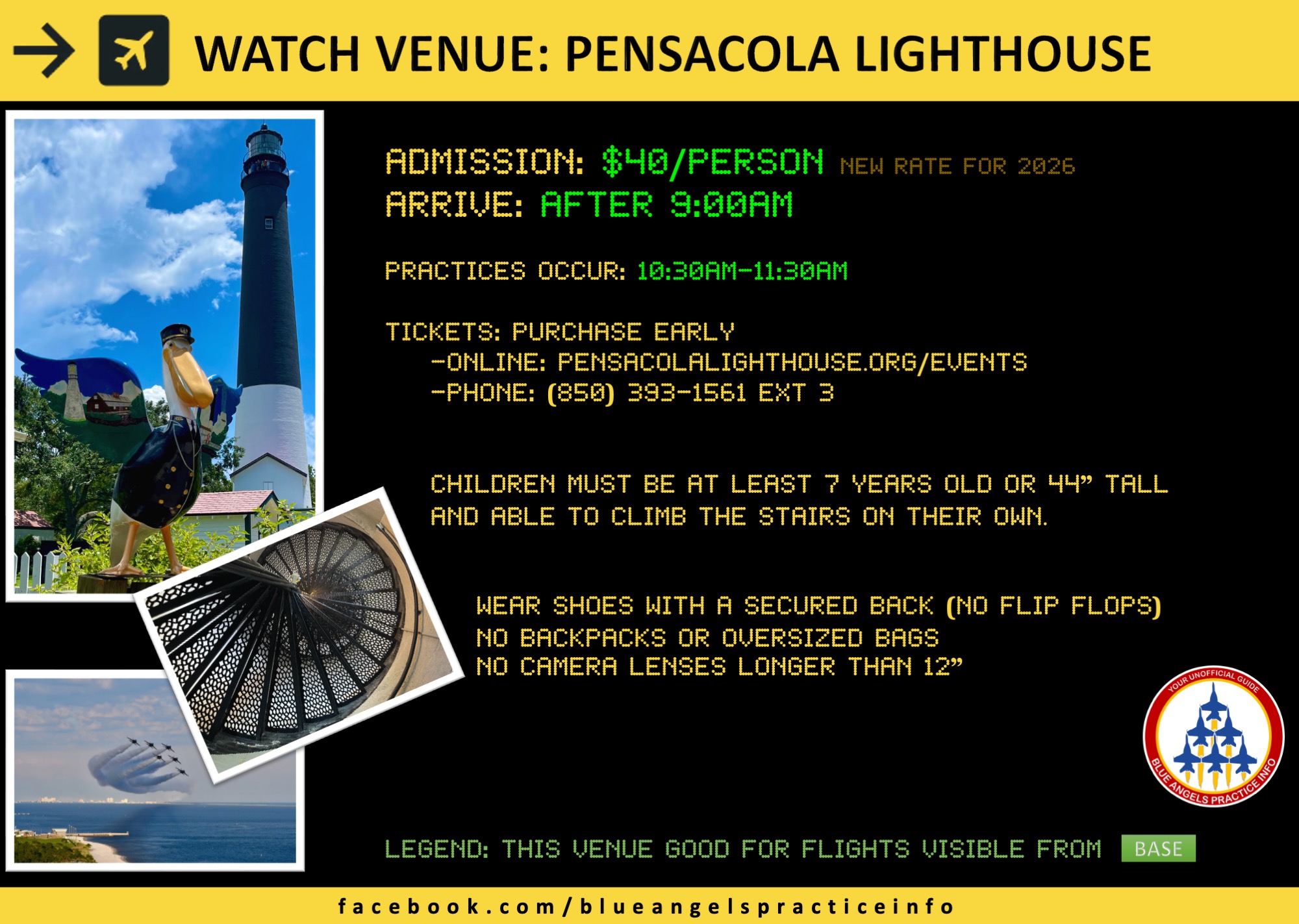 Viewing the practice from the balcony of the Pensacola Lighthouse, 130 feet off the ground, is an experience that you won’t soon forget! Be aware that these tickets go on sale in the Spring each year and sell out very fast! Visit their website for more information.